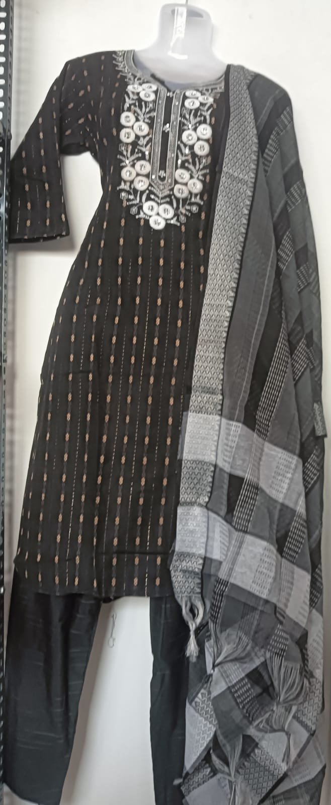 Elegant black kurti set featuring delicate vertical motifs and intricate silver floral embroidery on the neckline. Paired with matching pants and a textured printed dupatta, perfect for festive gatherings, evening events, and graceful celebrations.